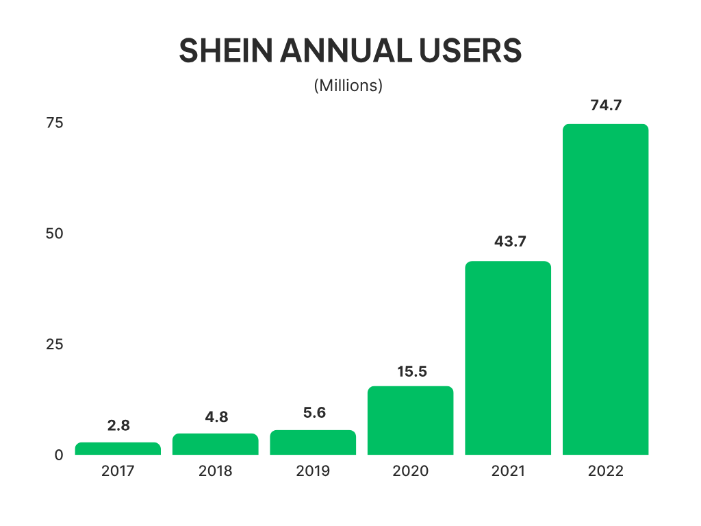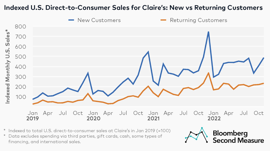 Comparison of Shein’s sales rate to Claire’s sales rate. Claire’s sales dropped drastically in 2022, while Shein’s sales skyrocketed. Left picture from Bloomberg Second Measure. Right picture from MobilLoud.