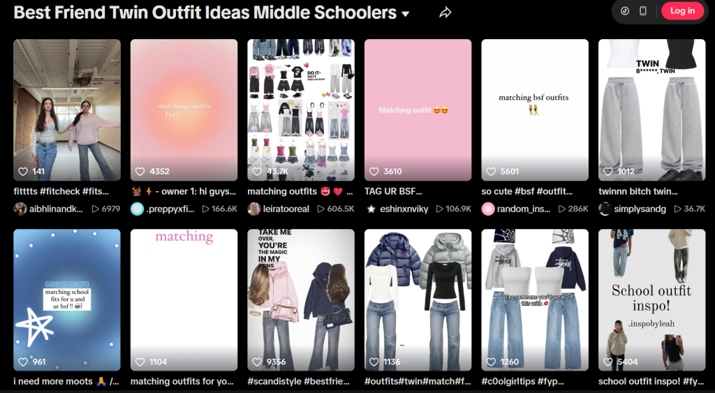 Comparison of tween/middle school fashion between middle schoolers in 2011 and middle school outfits influenced by Tiktok in 2025. The 2011 looks are more colorful and experimental, while the 2025 ones have little to no colors and look more basic, put together, and matchy. Left picture taken from The Odyssey Online, right picture screenshotted from Tiktok.